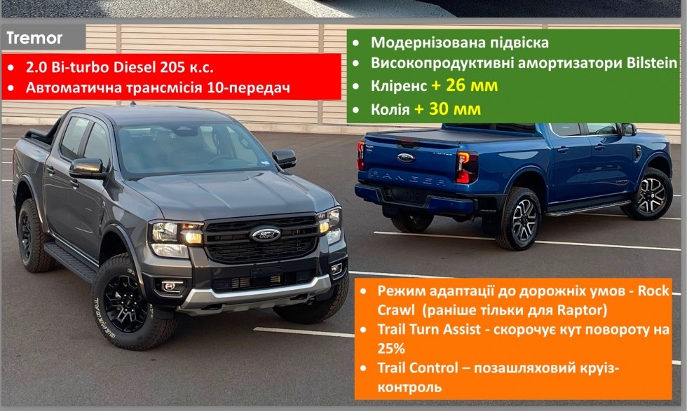 Останні кілька років довелось чимало їздити пікапами. Різними. Старими і новішими, з лівим і правим кермом. Траплялись навіть не з дизельними, а з бензиновими моторами. На одних ми вчили хлопців в нашій школі з Сергієм Волощенко, Євгеном Сокуром, Денисом Маловічко та «Інженером» користуватись повним приводом та долати перешкоди. Інші переганяли з друзями з благодійного фонду «Територія життя» для відправки в ЗСУ. І всі ці машини хотілося покращити, налаштувати. Аж ось потрапив в руки один, який би я взяв як є. Без змін! На тест до нас потрапив Ford Ranger в комплектації Tremor. Що це? Недораптор? Чи може просто красивий обвіс? Все перевірили і маємо розповісти вам.